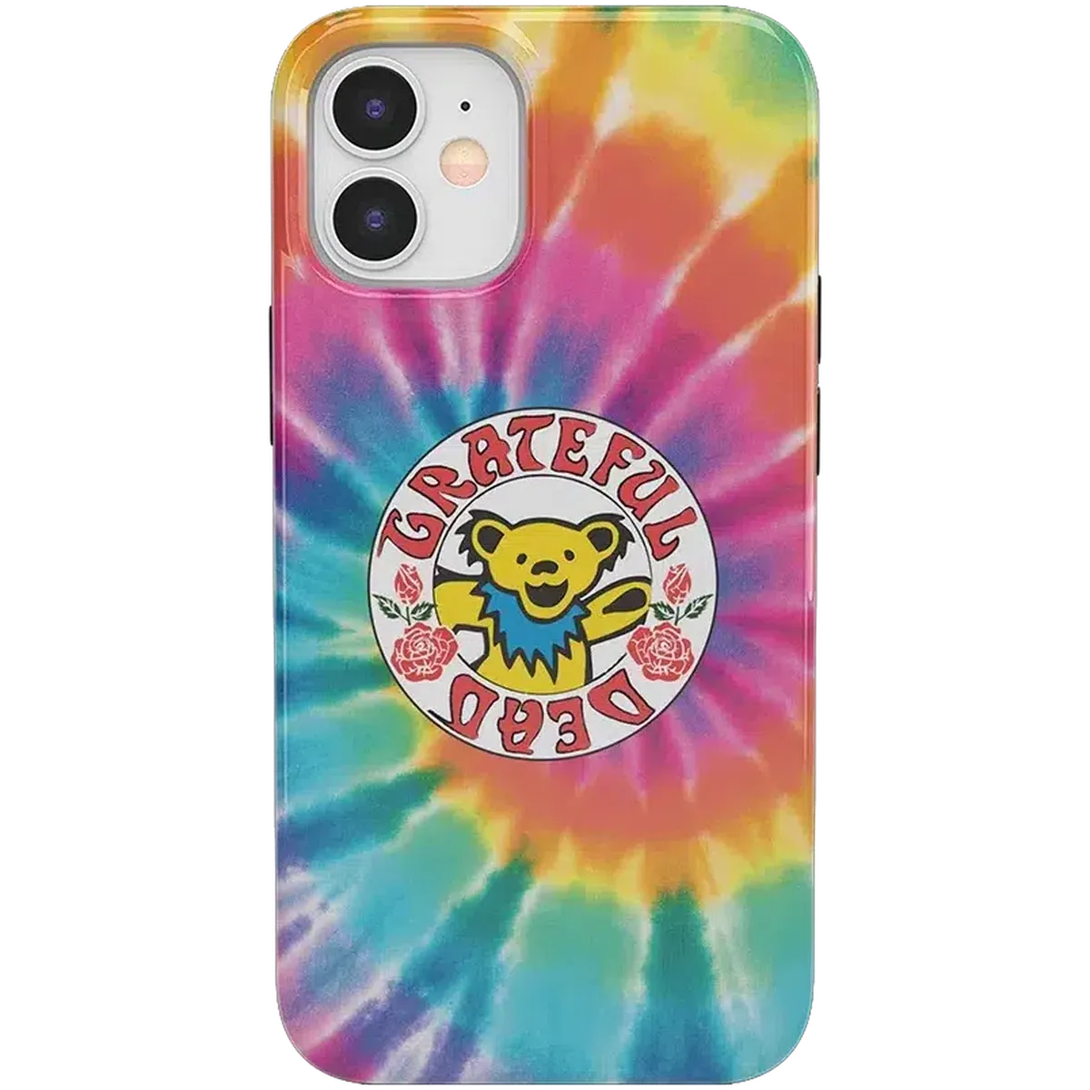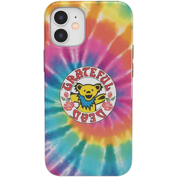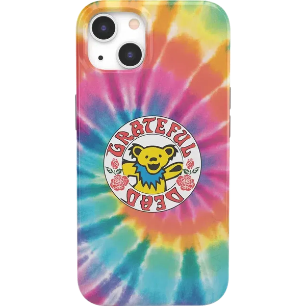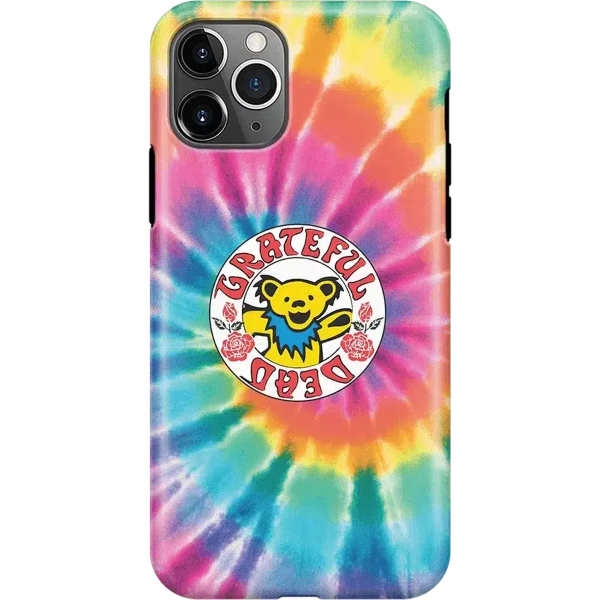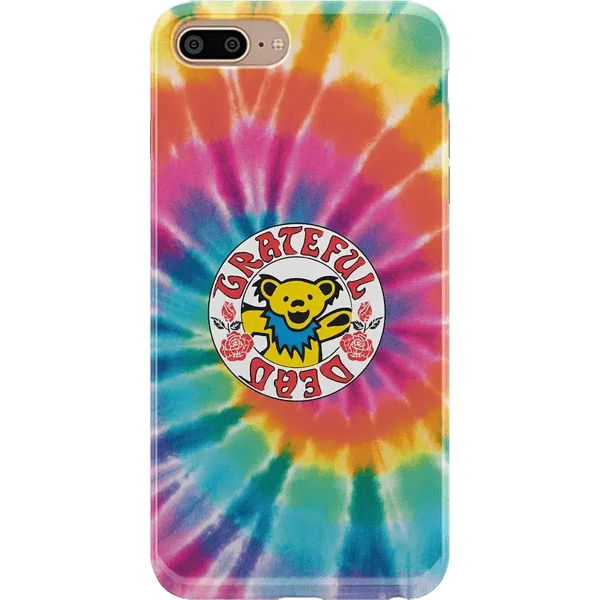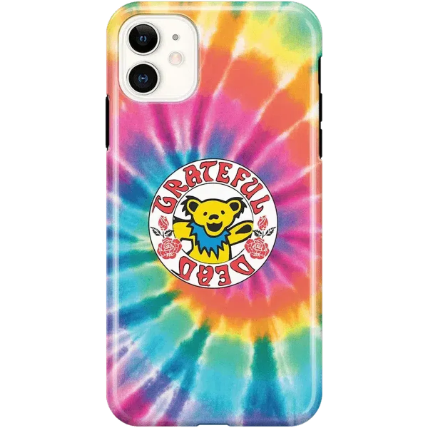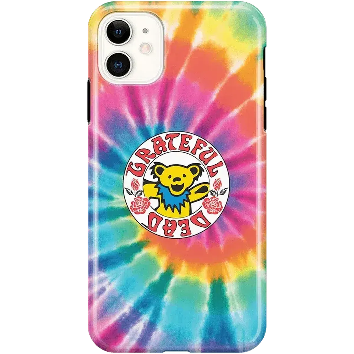 This case features one of the band’s iconic dancing bears with its arms in an open. welcoming stance. Inside a white circle. the band’s name is spelled out around the yellow bear. A spiral tie dye pattern of blue. green. pink. purple. orange. and yellow surrounds the image.