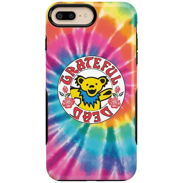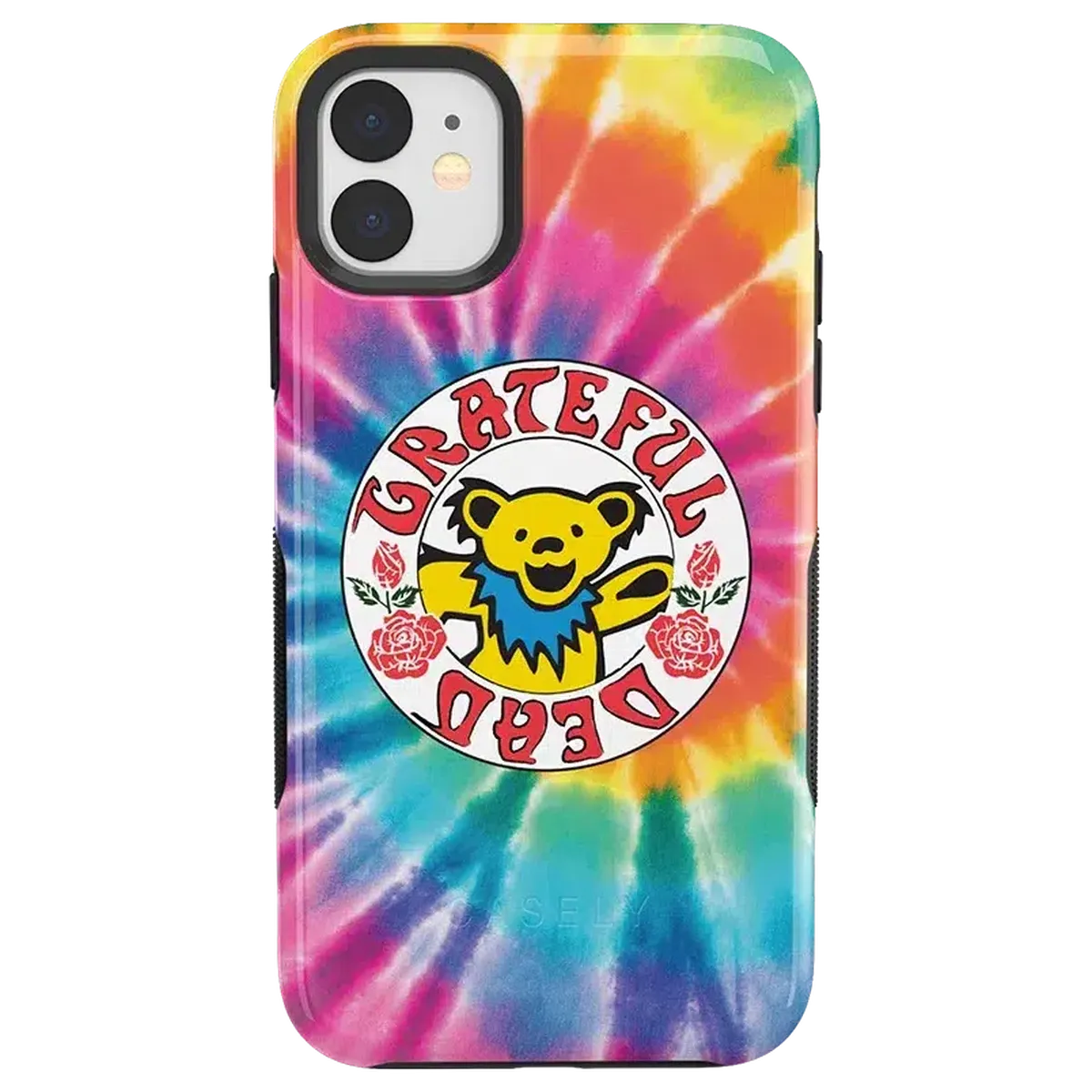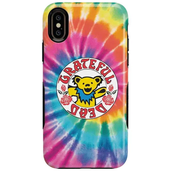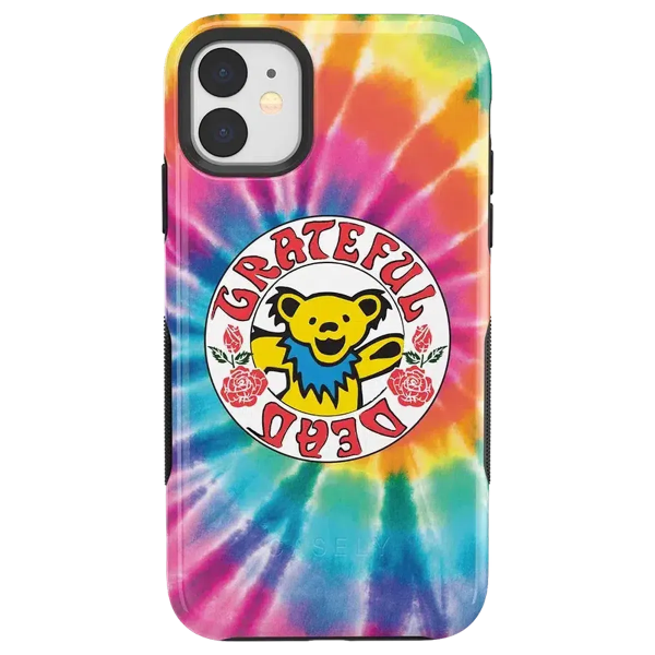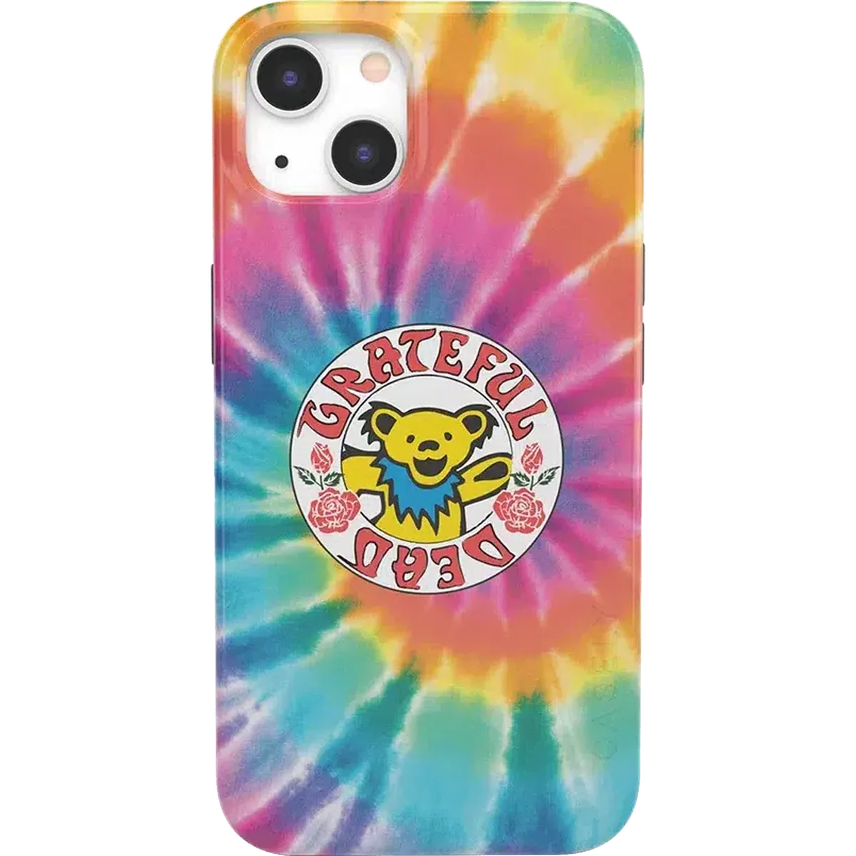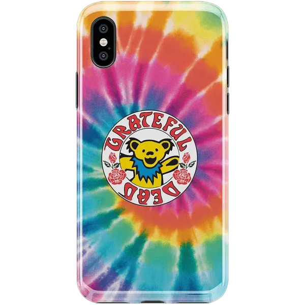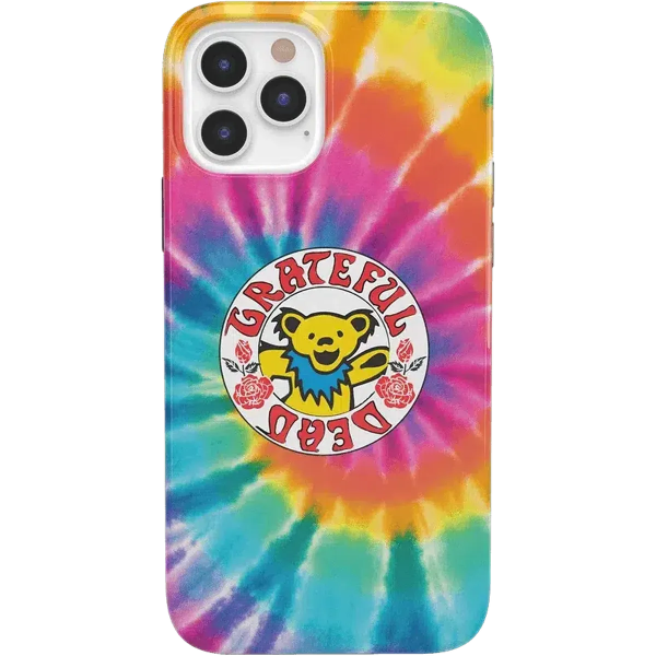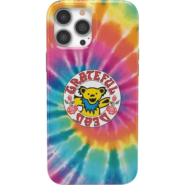 This case features one of the band’s iconic dancing bears with its arms in an open. welcoming stance. Inside a white circle. the band’s name is spelled out around the yellow bear. A spiral tie dye pattern of blue. green. pink. purple. orange. and yellow surrounds the image.