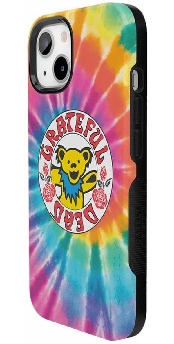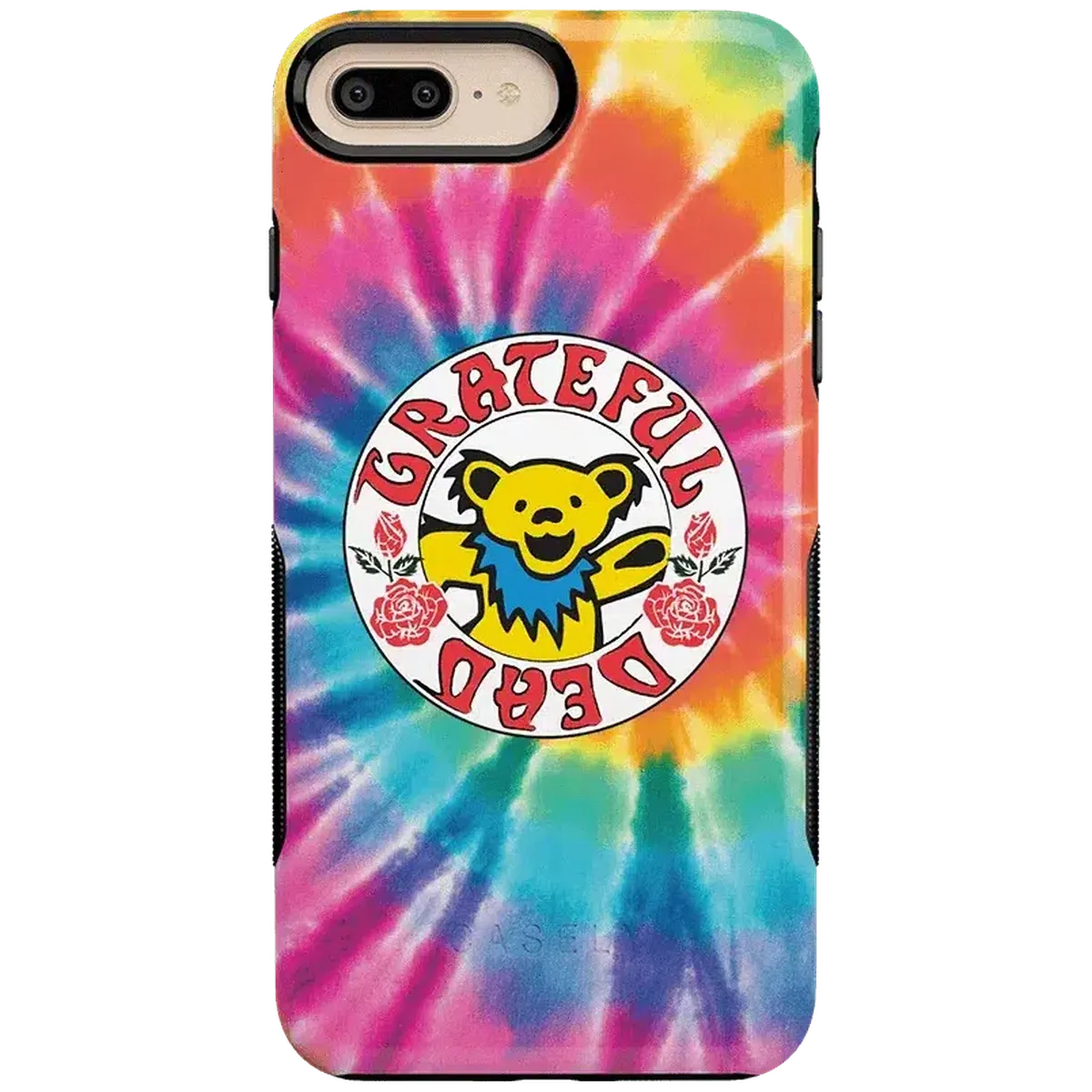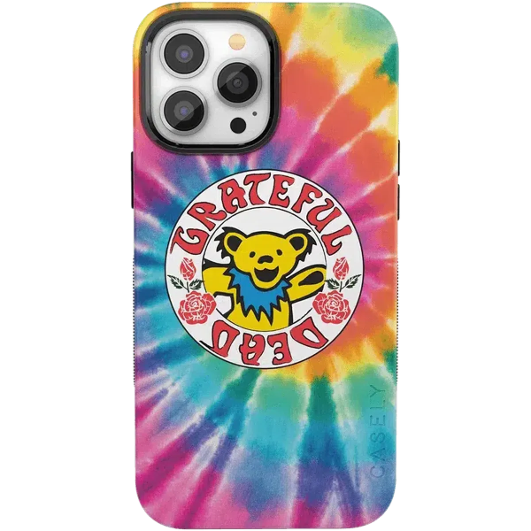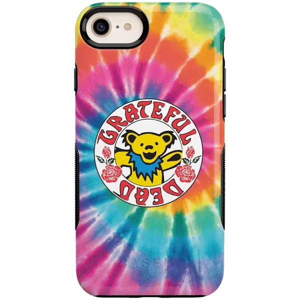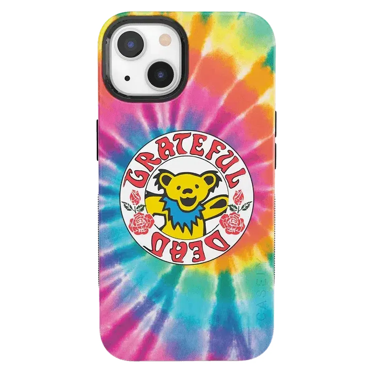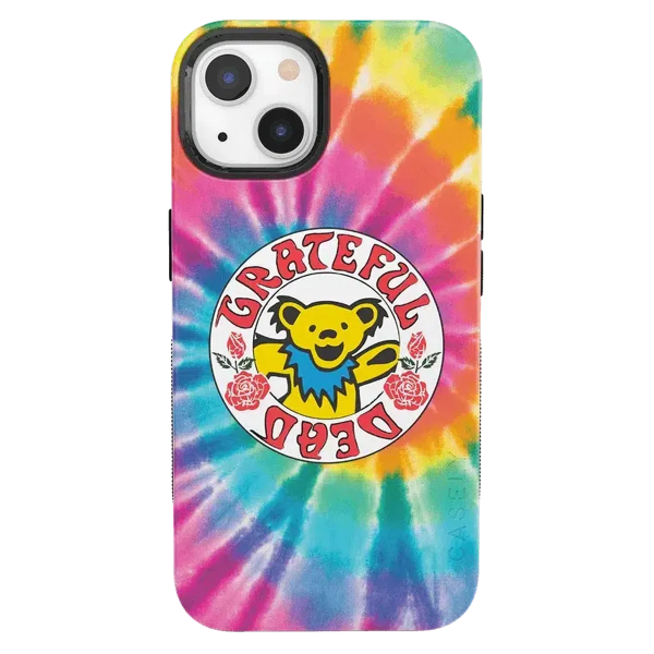 This case features one of the band’s iconic dancing bears with its arms in an open. welcoming stance. Inside a white circle. the band’s name is spelled out around the yellow bear. A spiral tie dye pattern of blue. green. pink. purple. orange. and yellow surrounds the image.